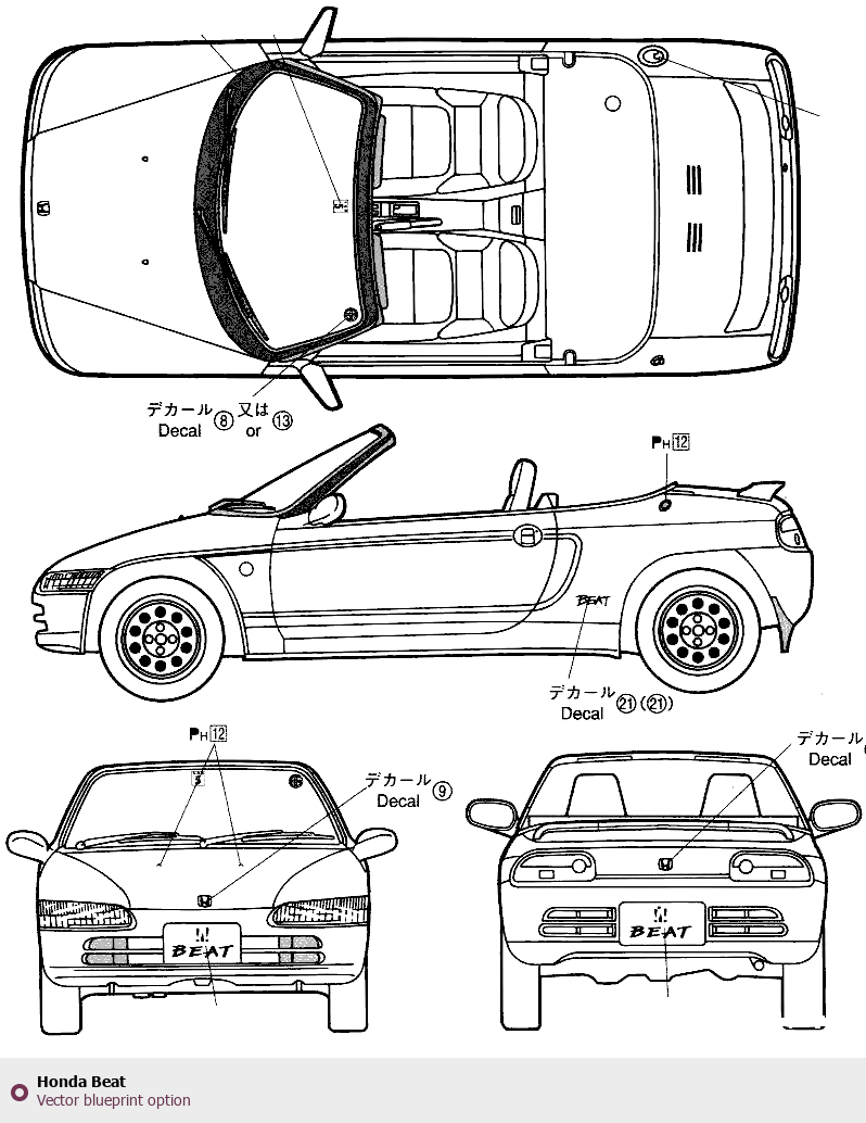 Raster blueprint of the Honda Beat Hatchback. This free downloadable image can be used for graphic projects, digital design, and 3D modeling. The file provides accurate exterior proportions of the vehicle. Body type: Hatchback.