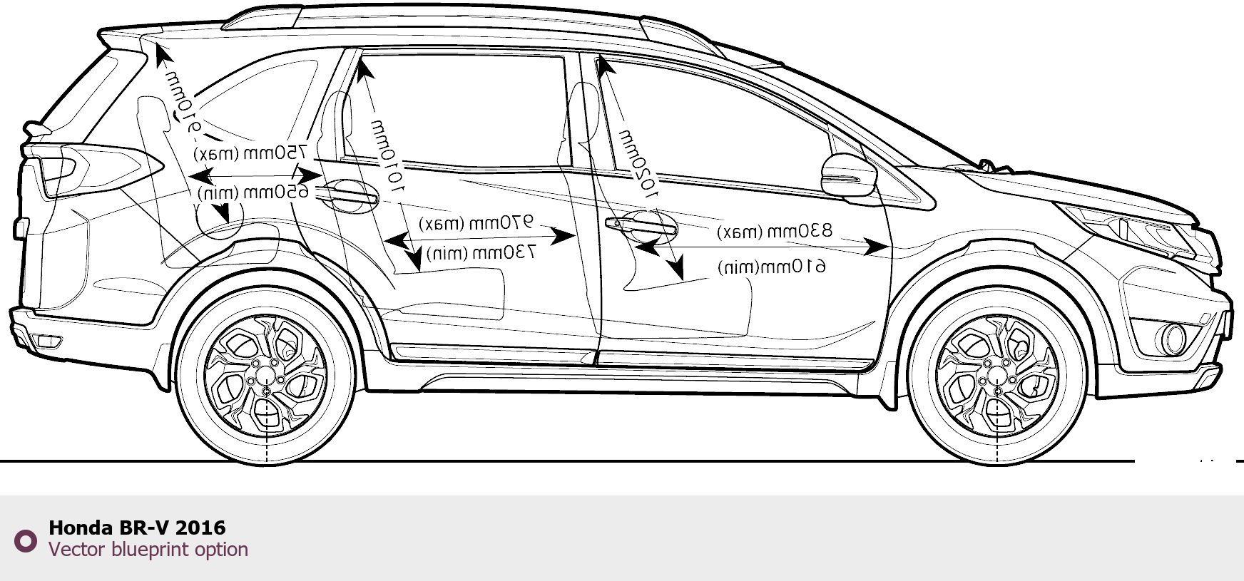 Raster blueprint of the 2016 Honda BR-V Tag. This free downloadable image can be used for graphic projects, digital design, and 3D modeling. The file provides accurate exterior proportions of the vehicle. Model year: 2016. Body type: Tag.