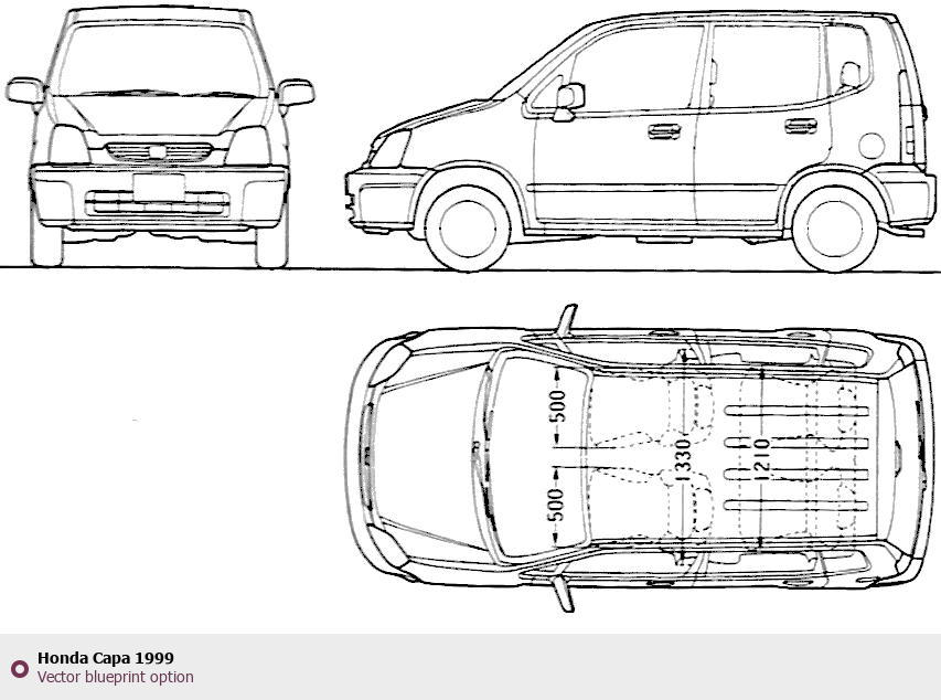 Raster blueprint of the 1999 Honda Capa Microvan. This free downloadable image can be used for graphic projects, digital design, and 3D modeling. The file provides accurate exterior proportions of the vehicle. Model year: 1999. Body type: Microvan.