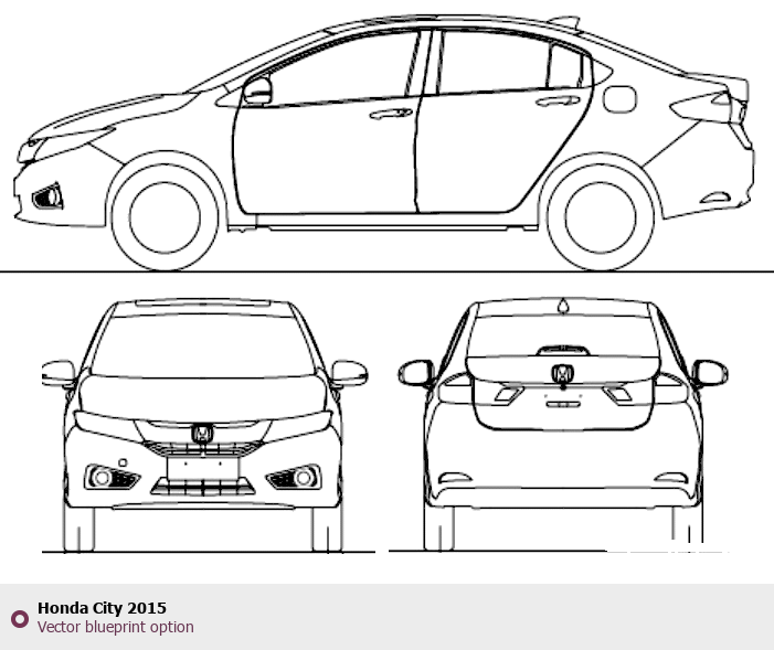 Raster blueprint of the 2015 Honda City Sedan. This free downloadable image can be used for graphic projects, digital design, and 3D modeling. The file provides accurate exterior proportions of the vehicle. Model year: 2015. Body type: Sedan.