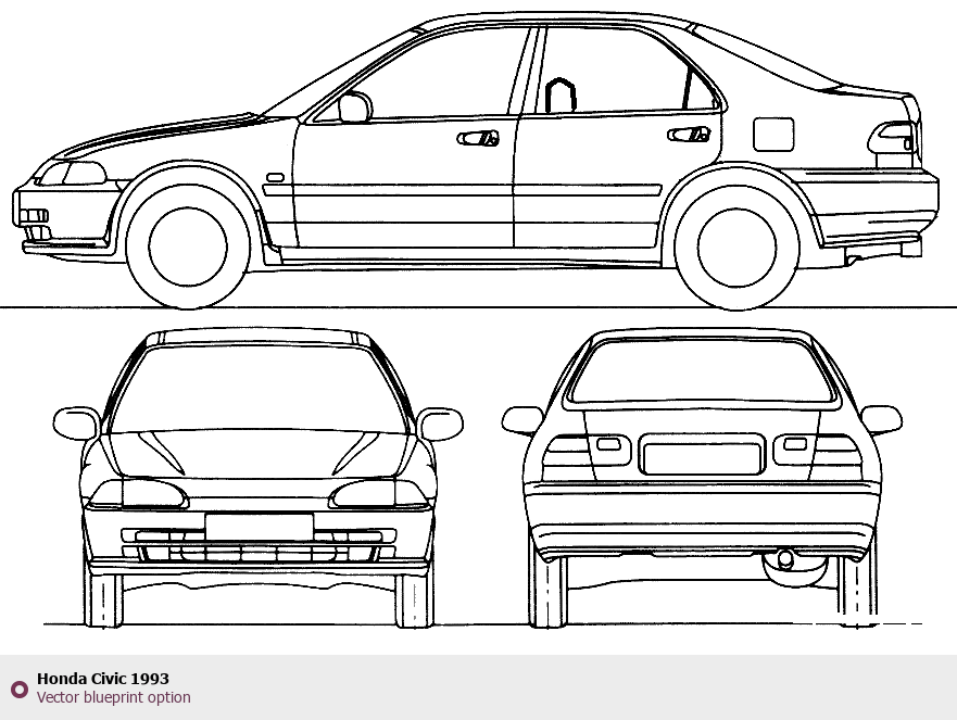 Raster blueprint of the 1993 Honda Civic Tag. This free downloadable image can be used for graphic projects, digital design, and 3D modeling. The file provides accurate exterior proportions of the vehicle. Model year: 1993. Body type: Tag.