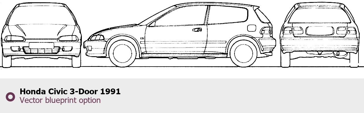 Raster blueprint of the 1991 Honda Civic 3-Door Tag. This free downloadable image can be used for graphic projects, digital design, and 3D modeling. The file provides accurate exterior proportions of the vehicle. Model year: 1991. Body type: Tag.