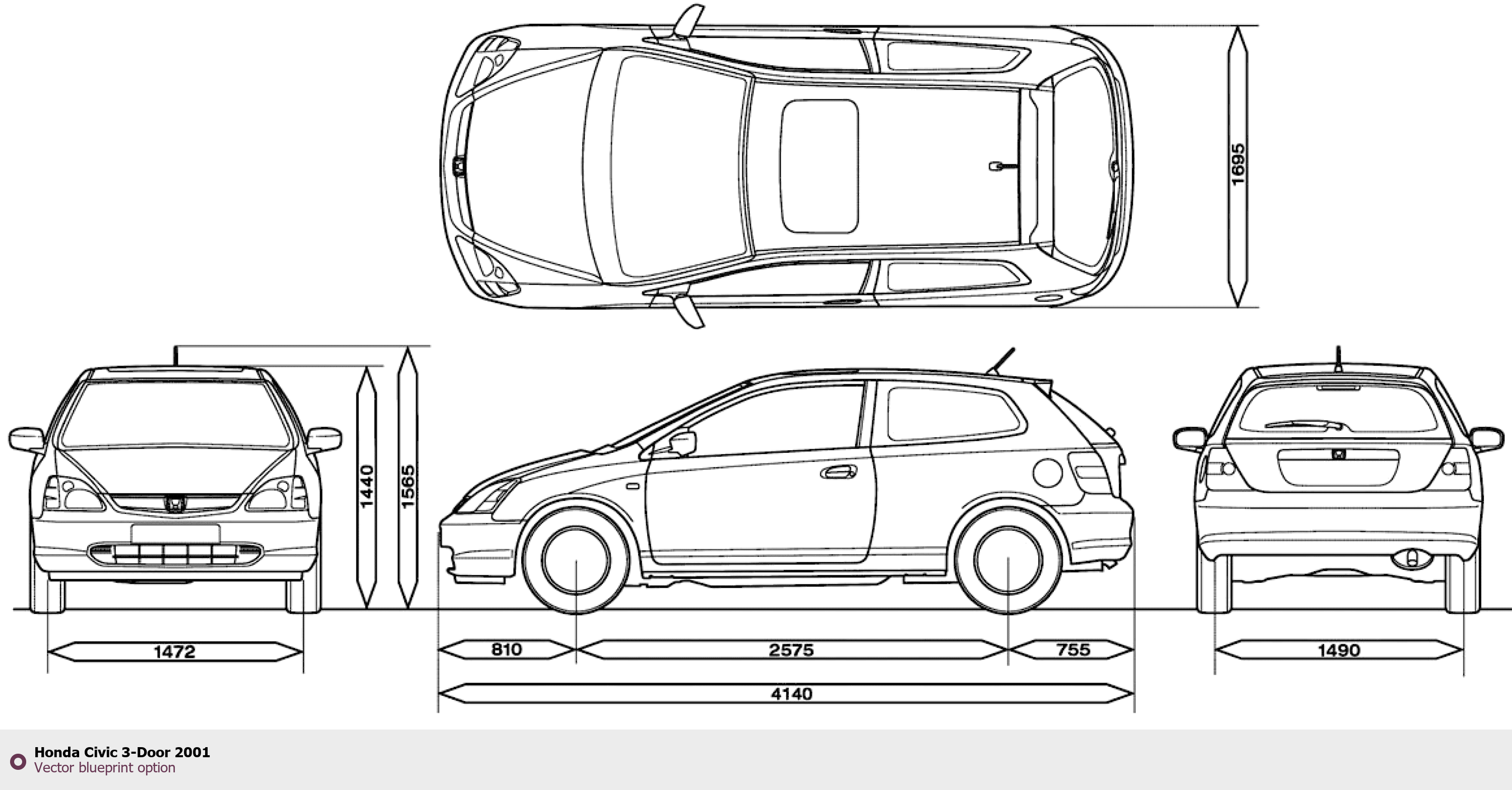 Raster blueprint of the 2001 Honda Civic 3-Door Tag. This free downloadable image can be used for graphic projects, digital design, and 3D modeling. The file provides accurate exterior proportions of the vehicle. Model year: 2001. Body type: Tag.