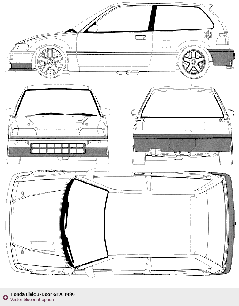 Raster blueprint of the 1989 Honda Civic 3-Door Gr.A Tag. This free downloadable image can be used for graphic projects, digital design, and 3D modeling. The file provides accurate exterior proportions of the vehicle. Model year: 1989. Body type: Tag.