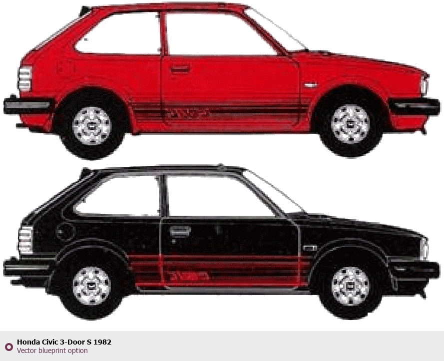 Raster blueprint of the 1982 Honda Civic 3-Door S Tag. This free downloadable image can be used for graphic projects, digital design, and 3D modeling. The file provides accurate exterior proportions of the vehicle. Model year: 1982. Body type: Tag.