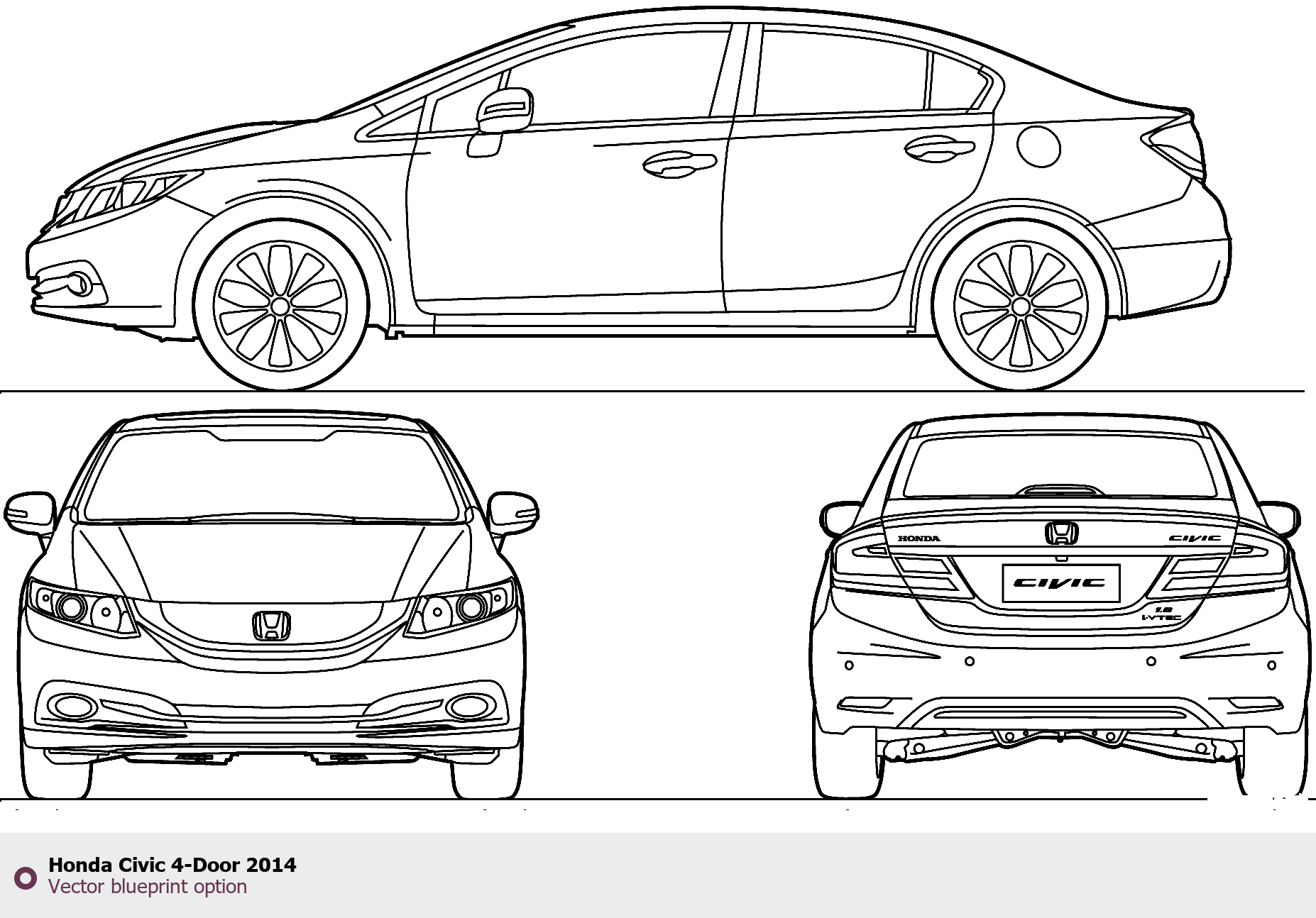 Raster blueprint of the 2014 Honda Civic 4-Door Tag. This free downloadable image can be used for graphic projects, digital design, and 3D modeling. The file provides accurate exterior proportions of the vehicle. Model year: 2014. Body type: Tag.