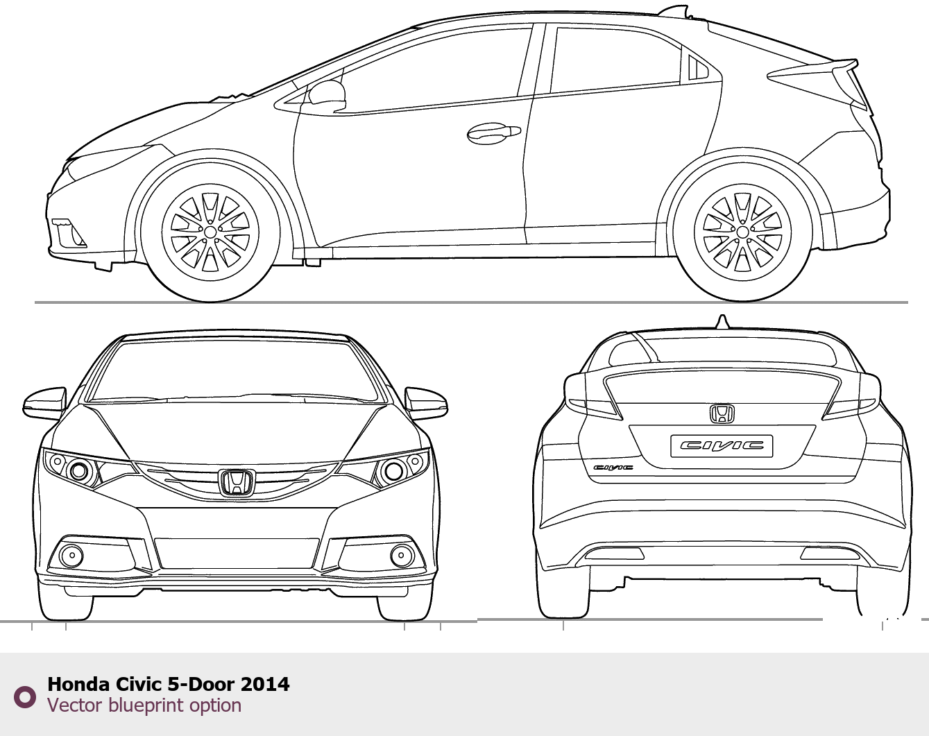 Raster blueprint of the 2014 Honda Civic 5-Door Tag. This free downloadable image can be used for graphic projects, digital design, and 3D modeling. The file provides accurate exterior proportions of the vehicle. Model year: 2014. Body type: Tag.