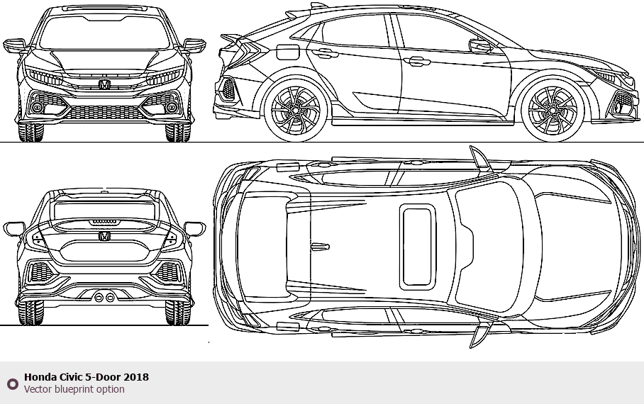 Raster blueprint of the 2018 Honda Civic 5-Door Tag. This free downloadable image can be used for graphic projects, digital design, and 3D modeling. The file provides accurate exterior proportions of the vehicle. Model year: 2018. Body type: Tag.