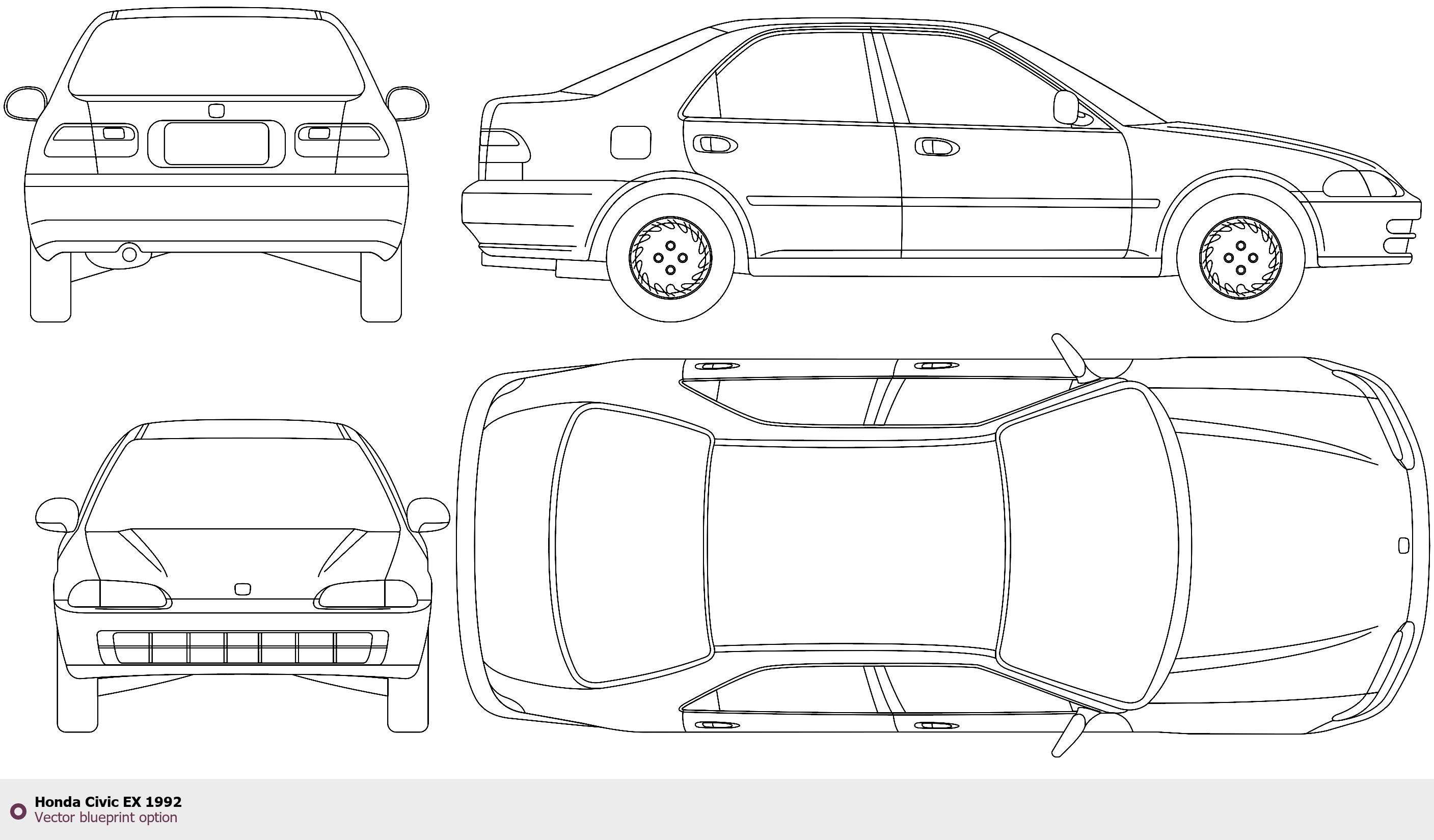 Raster blueprint of the 1992 Honda Civic EX Tag. This free downloadable image can be used for graphic projects, digital design, and 3D modeling. The file provides accurate exterior proportions of the vehicle. Model year: 1992. Body type: Tag.