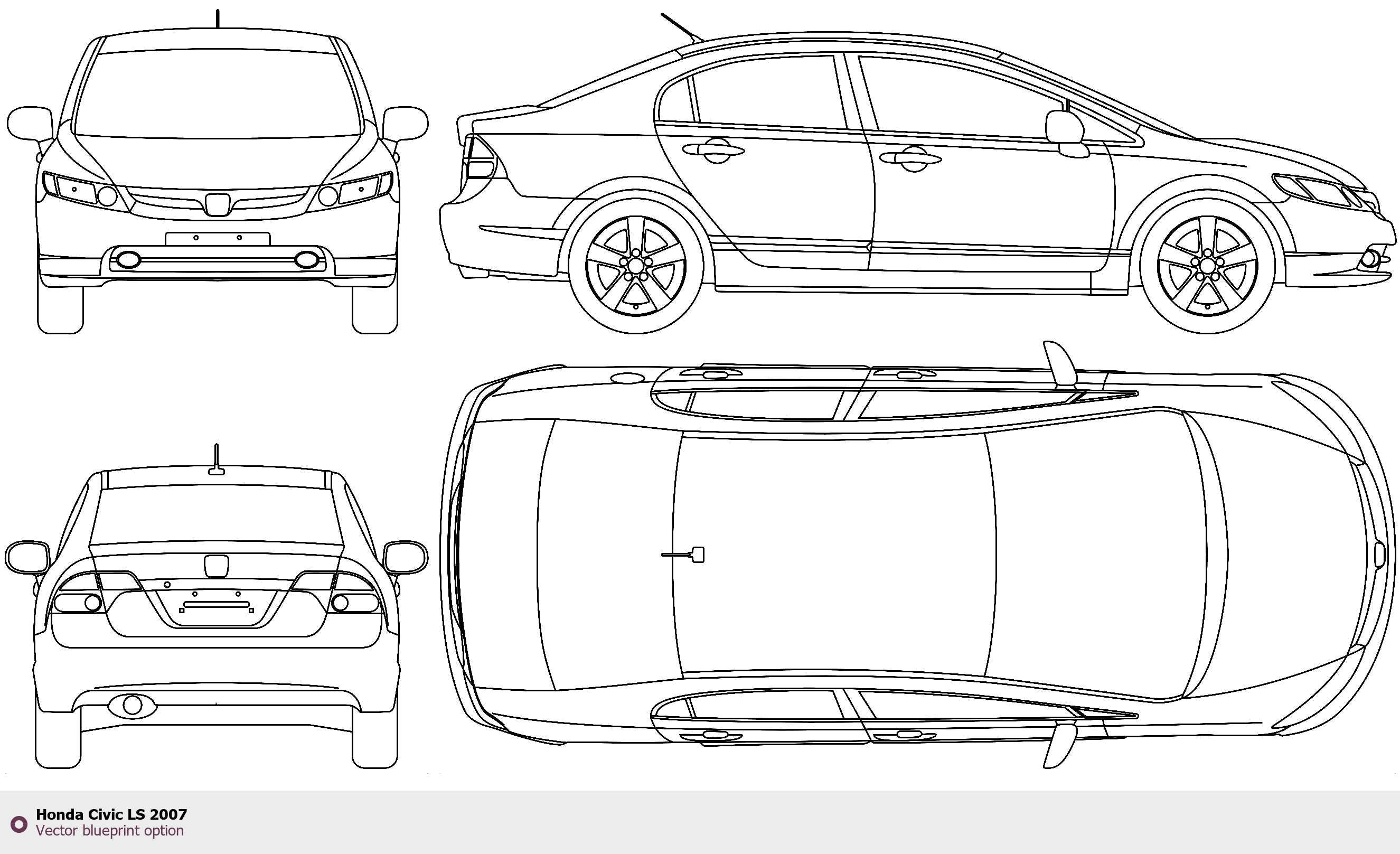 Raster blueprint of the 2007 Honda Civic LS Tag. This free downloadable image can be used for graphic projects, digital design, and 3D modeling. The file provides accurate exterior proportions of the vehicle. Model year: 2007. Body type: Tag.