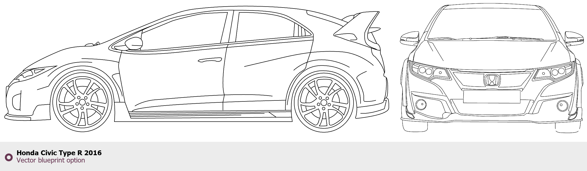 Raster blueprint of the 2016 Honda Civic Type R Hatchback. This free downloadable image can be used for graphic projects, digital design, and 3D modeling. The file provides accurate exterior proportions of the vehicle. Model year: 2016. Body type: Hatchback.