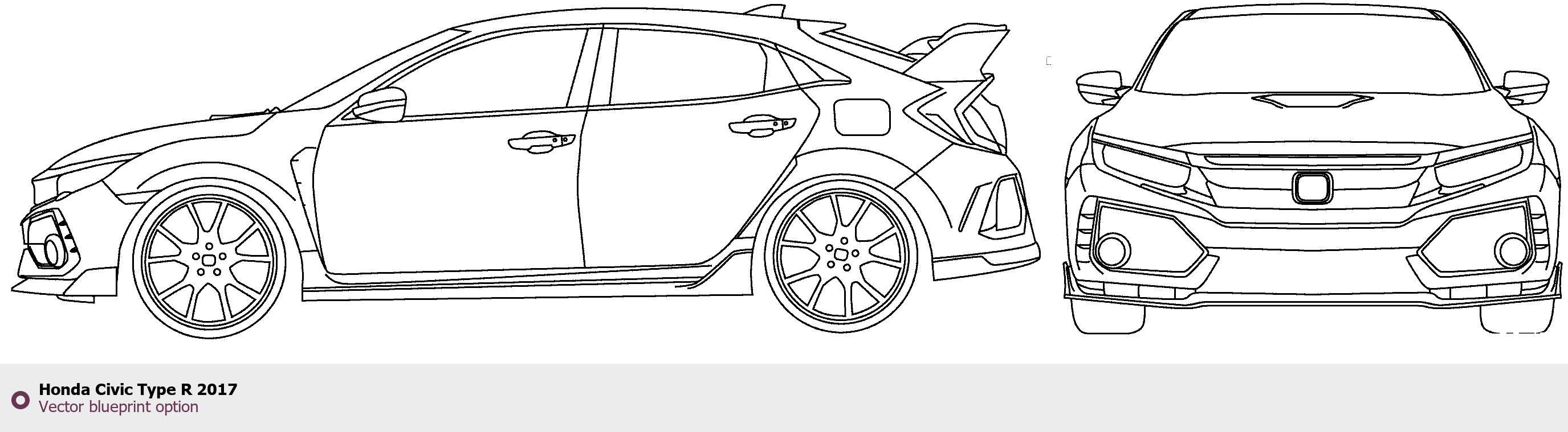 Raster blueprint of the 2017 Honda Civic Type R Hatchback. This free downloadable image can be used for graphic projects, digital design, and 3D modeling. The file provides accurate exterior proportions of the vehicle. Model year: 2017. Body type: Hatchback.