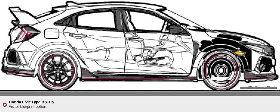 Raster blueprint of the 2019 Honda Civic Type R Hatchback. This free downloadable image can be used for graphic projects, digital design, and 3D modeling. The file provides accurate exterior proportions of the vehicle. Model year: 2019. Body type: Hatchback.