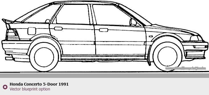 Raster blueprint of the 1991 Honda Concerto 5-Door Hatchback. This free downloadable image can be used for graphic projects, digital design, and 3D modeling. The file provides accurate exterior proportions of the vehicle. Model year: 1991. Body type: Hatchback.