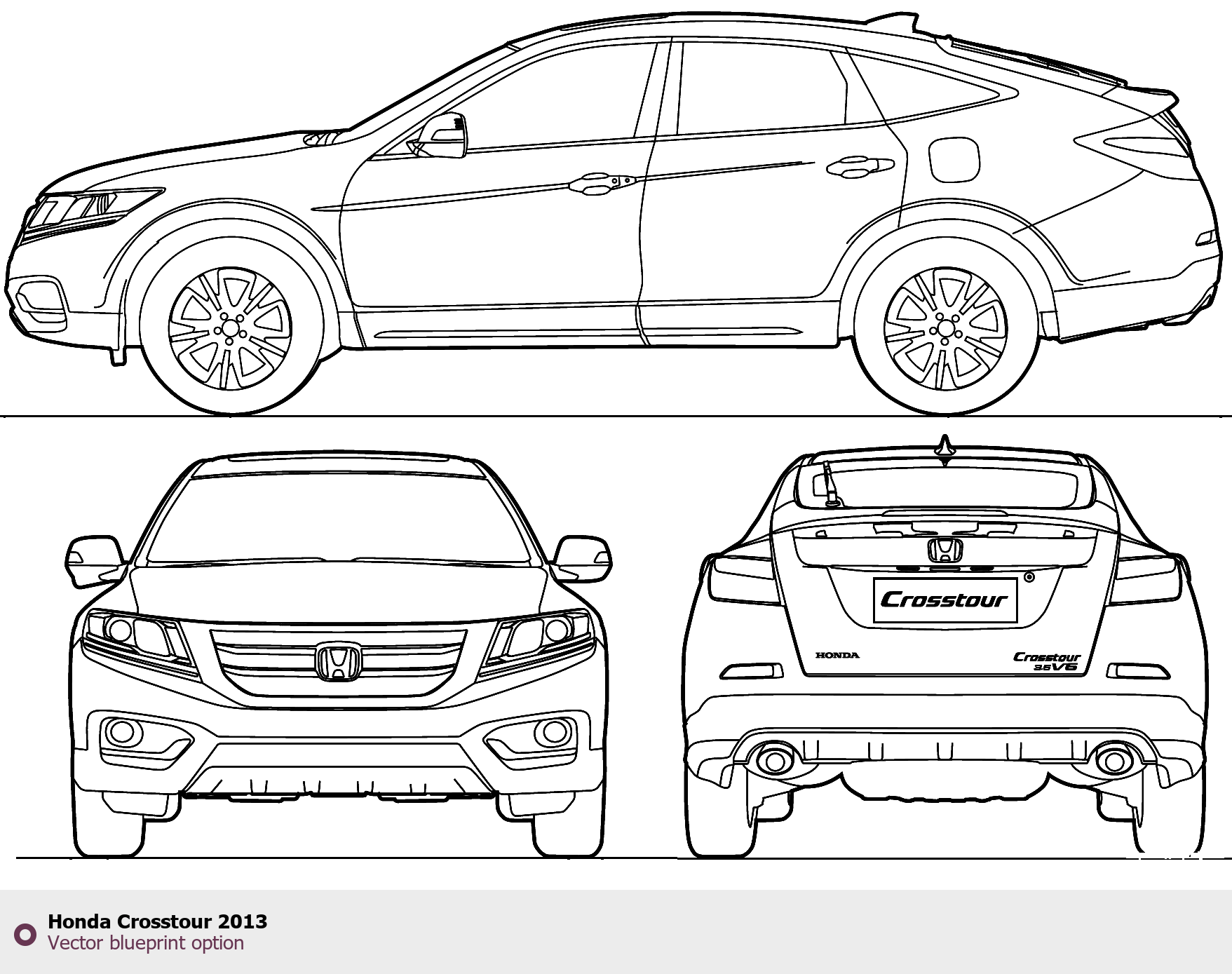 Raster blueprint of the 2013 Honda Crosstour SUV. This free downloadable image can be used for graphic projects, digital design, and 3D modeling. The file provides accurate exterior proportions of the vehicle. Model year: 2013. Body type: SUV.