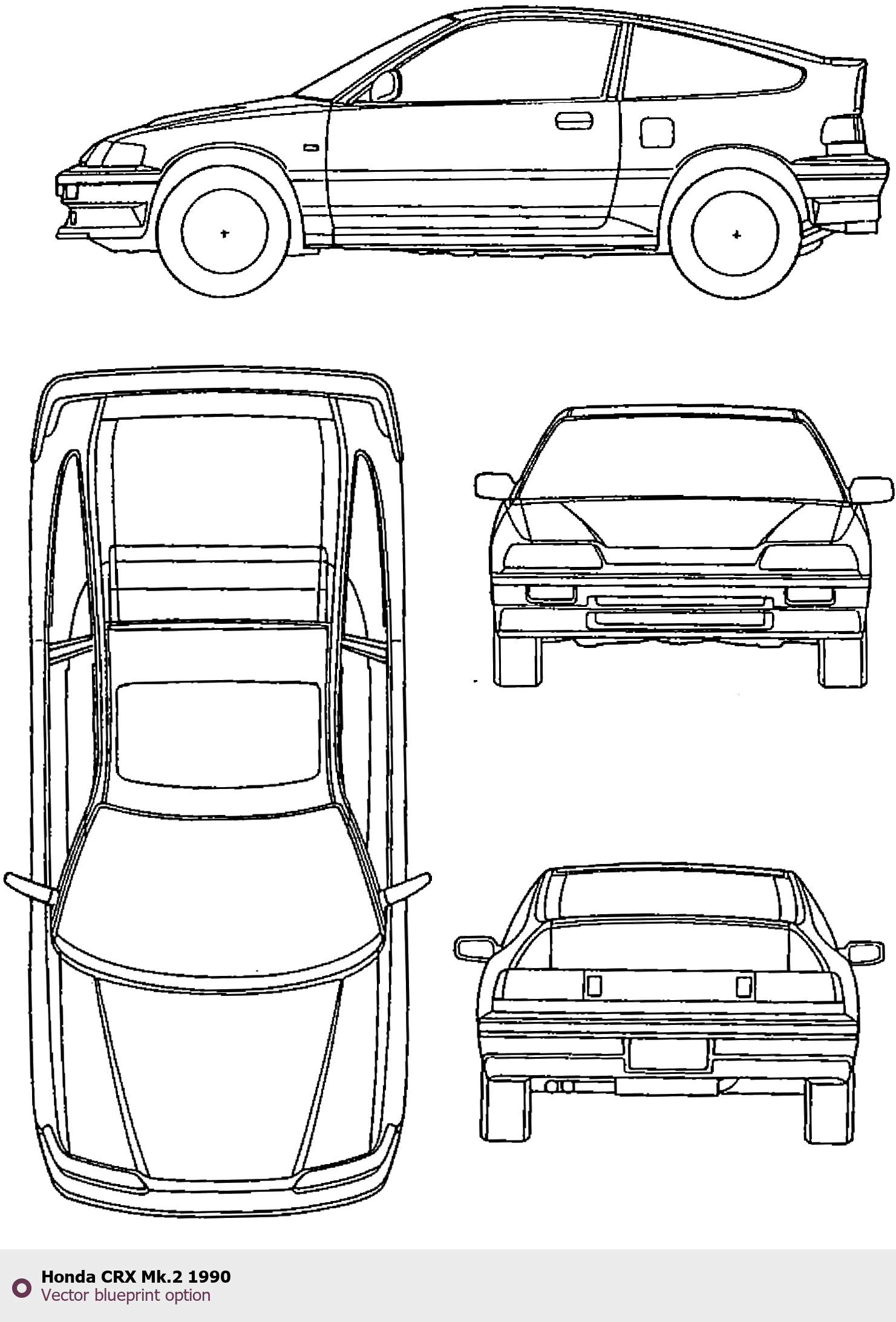 Raster blueprint of the 1990 Honda CRX Mk.2 Tag. This free downloadable image can be used for graphic projects, digital design, and 3D modeling. The file provides accurate exterior proportions of the vehicle. Model year: 1990. Body type: Tag.
