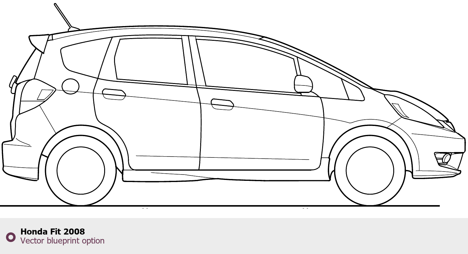 Raster blueprint of the 2008 Honda Fit Hatchback. This free downloadable image can be used for graphic projects, digital design, and 3D modeling. The file provides accurate exterior proportions of the vehicle. Model year: 2008. Body type: Hatchback.