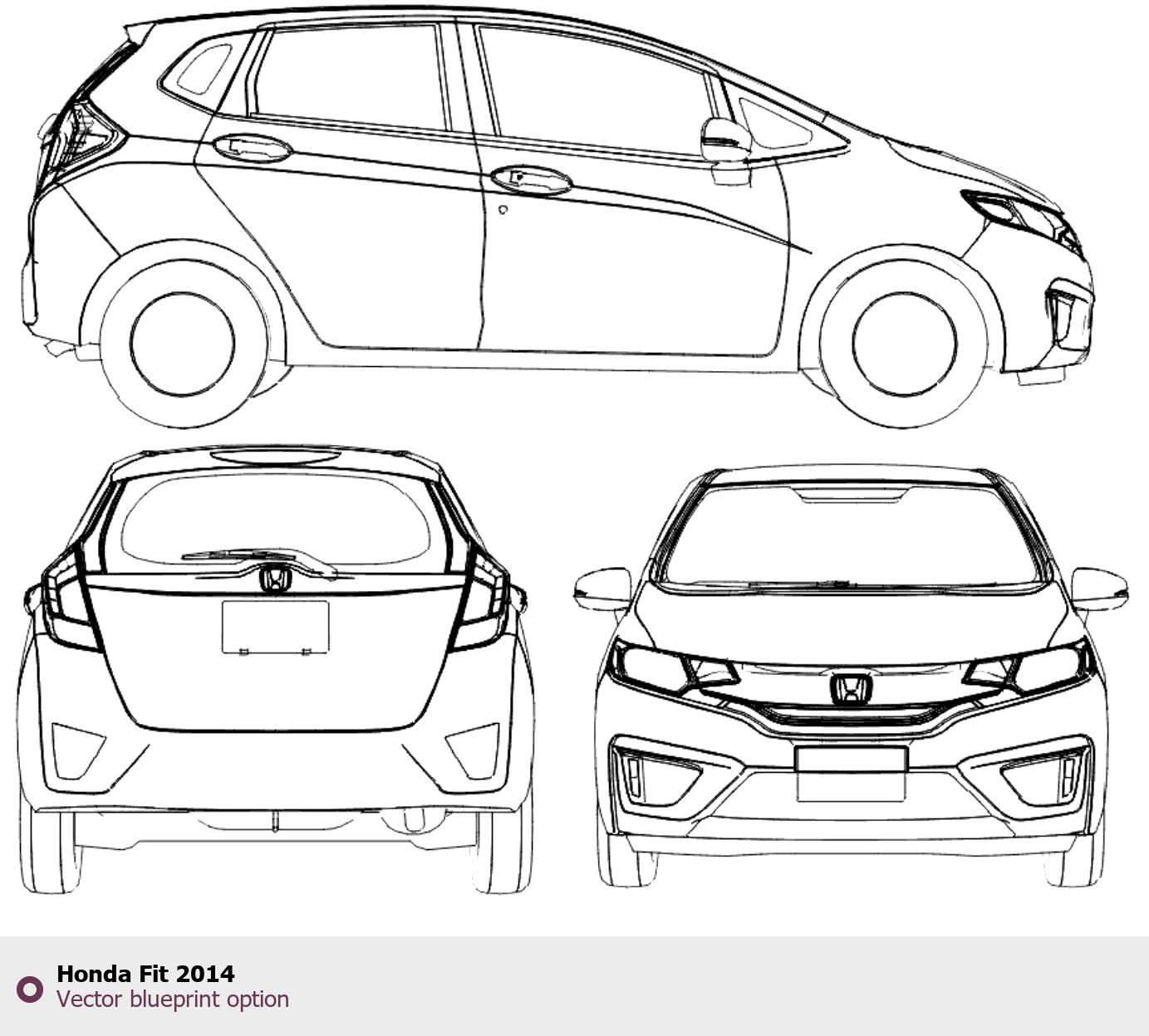 Raster blueprint of the 2014 Honda Fit Hatchback. This free downloadable image can be used for graphic projects, digital design, and 3D modeling. The file provides accurate exterior proportions of the vehicle. Model year: 2014. Body type: Hatchback.