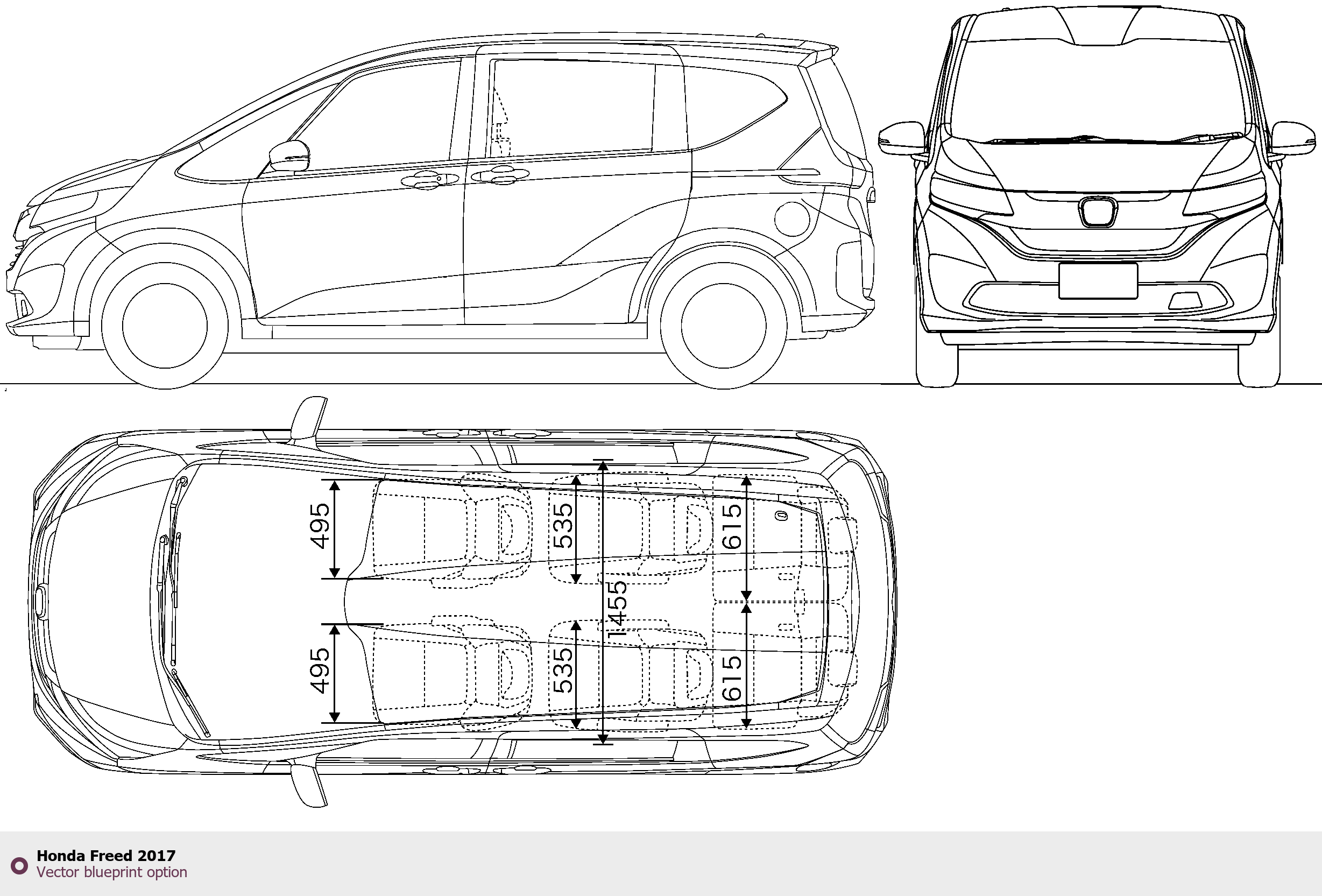 Raster blueprint of the 2017 Honda Freed Minivan. This free downloadable image can be used for graphic projects, digital design, and 3D modeling. The file provides accurate exterior proportions of the vehicle. Model year: 2017. Body type: Minivan.