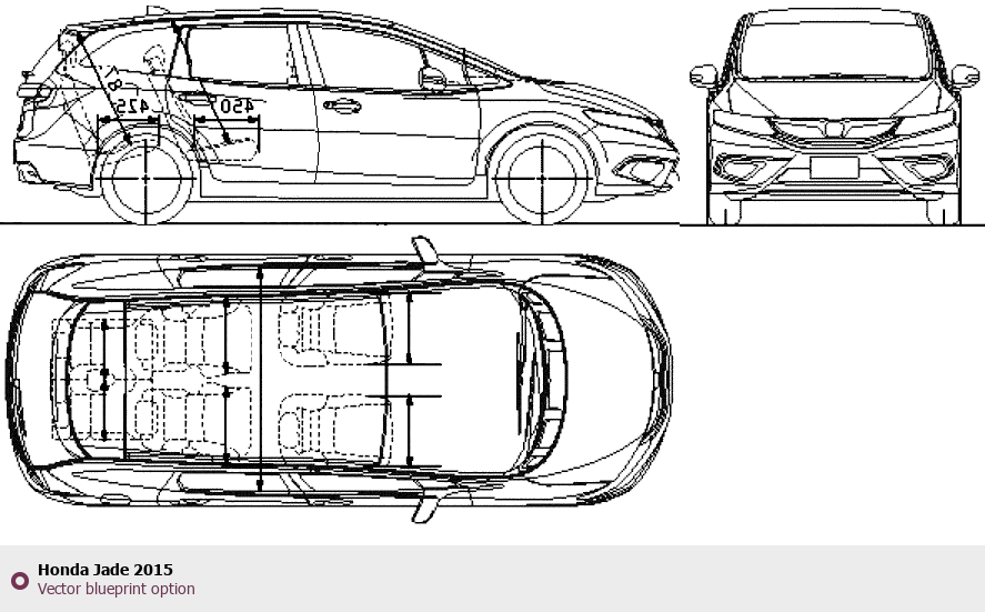 Raster blueprint of the 2015 Honda Jade Hatchback. This free downloadable image can be used for graphic projects, digital design, and 3D modeling. The file provides accurate exterior proportions of the vehicle. Model year: 2015. Body type: Hatchback.