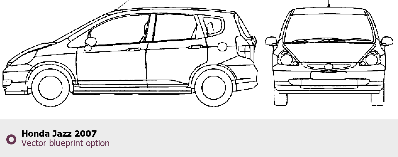 Raster blueprint of the 2007 Honda Jazz Hatchback. This free downloadable image can be used for graphic projects, digital design, and 3D modeling. The file provides accurate exterior proportions of the vehicle. Model year: 2007. Body type: Hatchback.