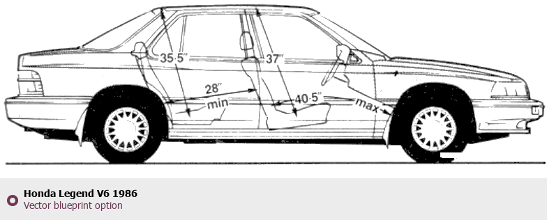 Raster blueprint of the 1986 Honda Legend V6 Sedan. This free downloadable image can be used for graphic projects, digital design, and 3D modeling. The file provides accurate exterior proportions of the vehicle. Model year: 1986. Body type: Sedan.
