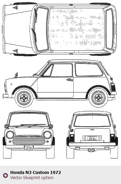 Raster blueprint of the 1972 Honda N3 Custom Tag. This free downloadable image can be used for graphic projects, digital design, and 3D modeling. The file provides accurate exterior proportions of the vehicle. Model year: 1972. Body type: Tag.
