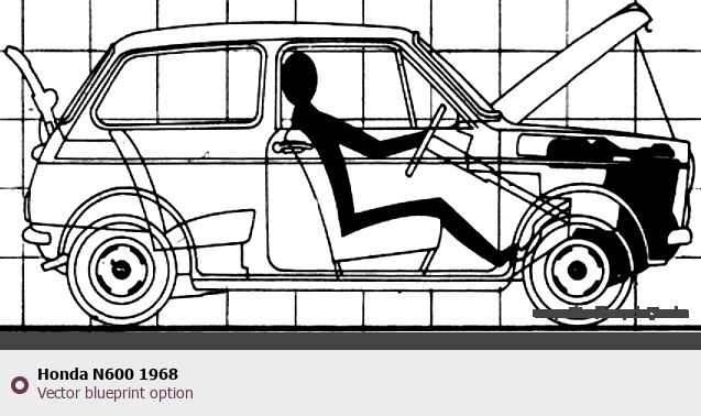 Raster blueprint of the 1968 Honda N600 Tag. This free downloadable image can be used for graphic projects, digital design, and 3D modeling. The file provides accurate exterior proportions of the vehicle. Model year: 1968. Body type: Tag.