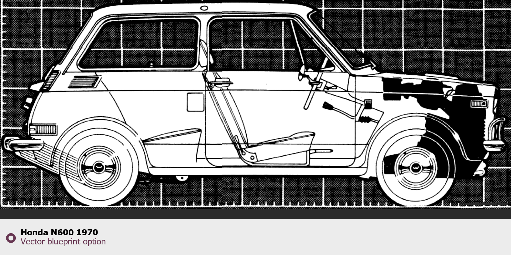 Raster blueprint of the 1970 Honda N600 Tag. This free downloadable image can be used for graphic projects, digital design, and 3D modeling. The file provides accurate exterior proportions of the vehicle. Model year: 1970. Body type: Tag.