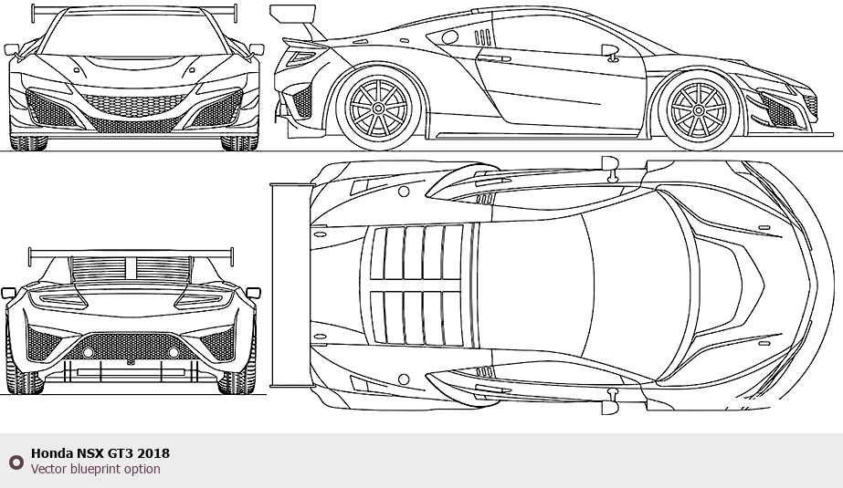 Raster blueprint of the 2018 Honda NSX GT3 Coupe. This free downloadable image can be used for graphic projects, digital design, and 3D modeling. The file provides accurate exterior proportions of the vehicle. Model year: 2018. Body type: Coupe.