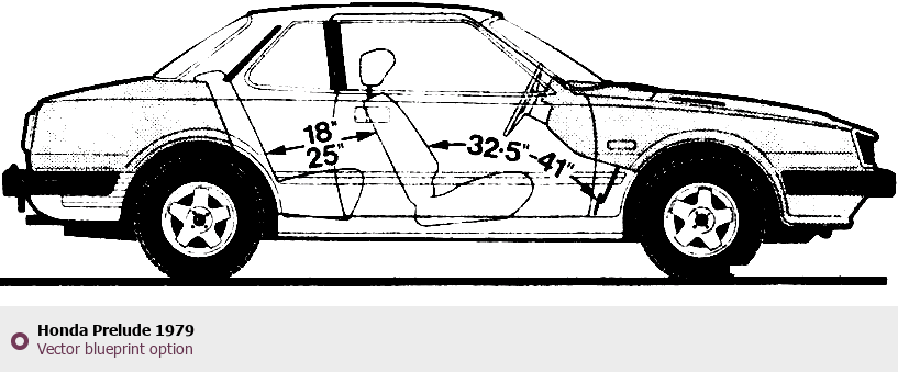 Raster blueprint of the 1979 Honda Prelude Coupe. This free downloadable image can be used for graphic projects, digital design, and 3D modeling. The file provides accurate exterior proportions of the vehicle. Model year: 1979. Body type: Coupe.