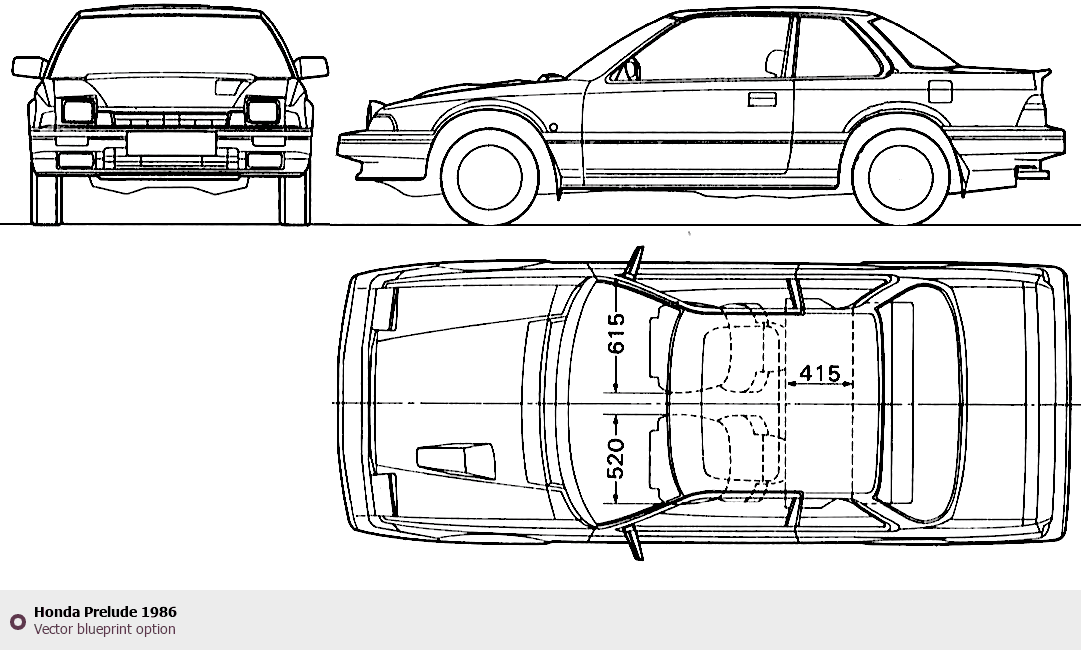 Raster blueprint of the 1986 Honda Prelude Coupe. This free downloadable image can be used for graphic projects, digital design, and 3D modeling. The file provides accurate exterior proportions of the vehicle. Model year: 1986. Body type: Coupe.