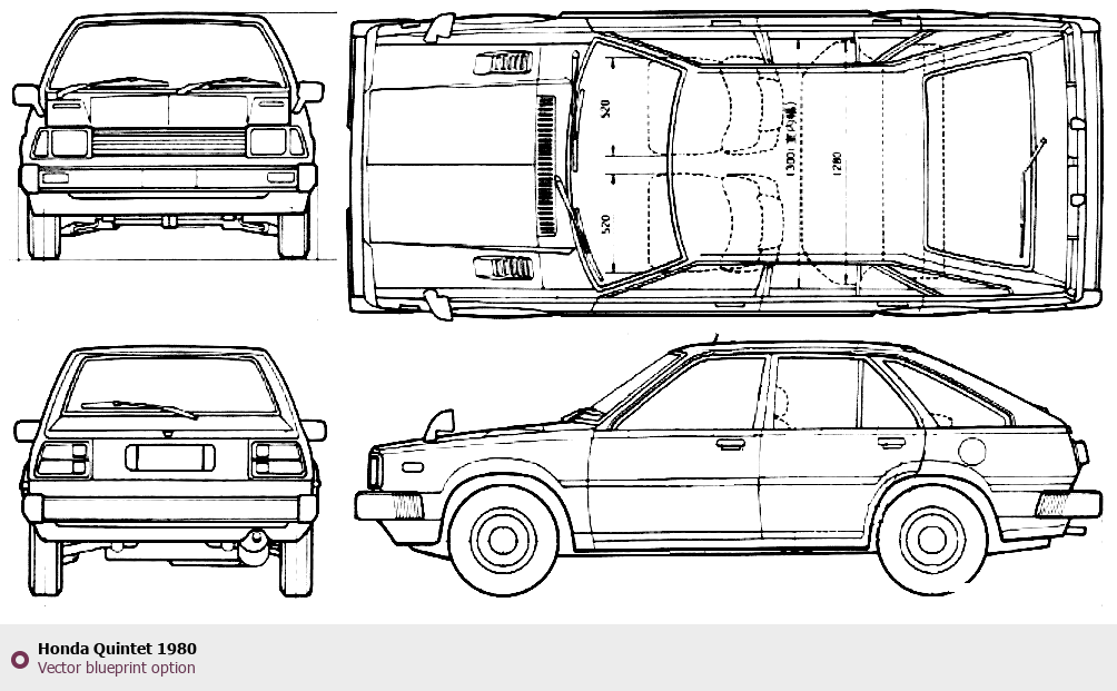 Raster blueprint of the 1980 Honda Quintet Hatchback. This free downloadable image can be used for graphic projects, digital design, and 3D modeling. The file provides accurate exterior proportions of the vehicle. Model year: 1980. Body type: Hatchback.