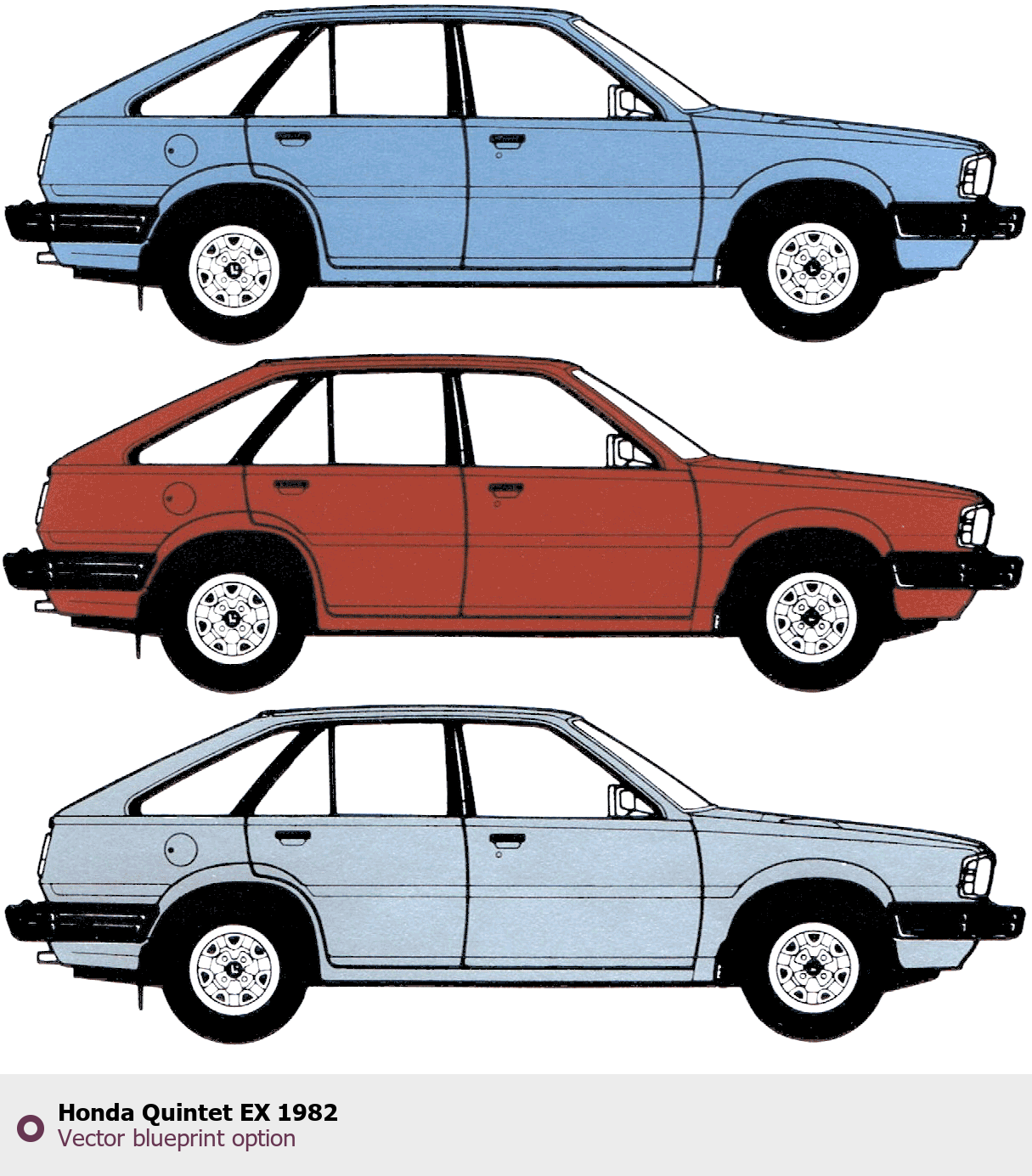 Raster blueprint of the 1982 Honda Quintet EX Hatchback. This free downloadable image can be used for graphic projects, digital design, and 3D modeling. The file provides accurate exterior proportions of the vehicle. Model year: 1982. Body type: Hatchback.