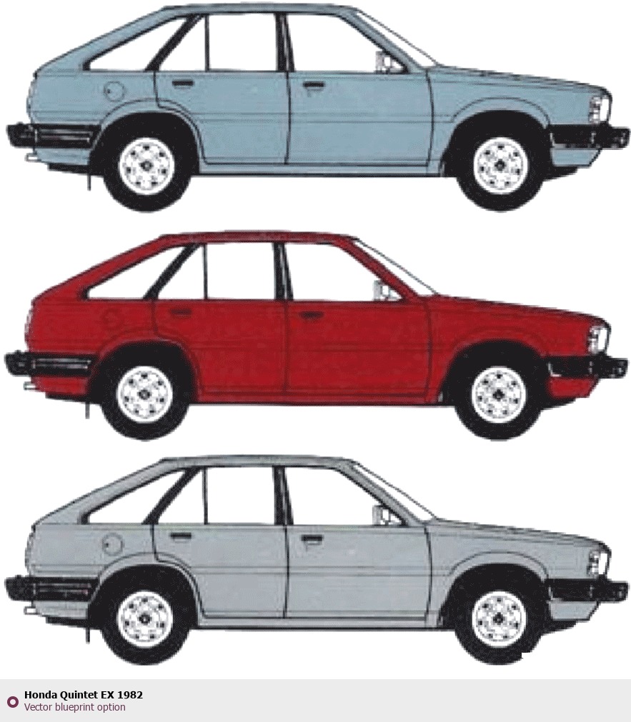 Raster blueprint of the 1982 Honda Quintet EX Hatchback. This free downloadable image can be used for graphic projects, digital design, and 3D modeling. The file provides accurate exterior proportions of the vehicle. Model year: 1982. Body type: Hatchback.