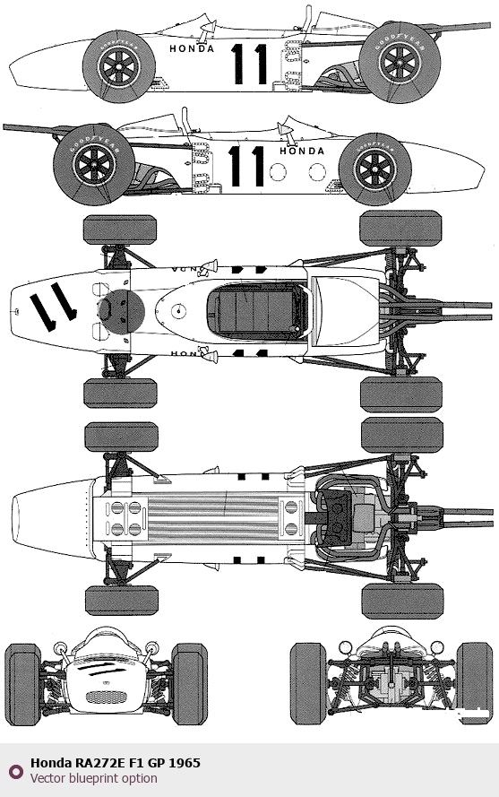 Raster blueprint of the 1965 Honda RA272E F1 GP Formula. This free downloadable image can be used for graphic projects, digital design, and 3D modeling. The file provides accurate exterior proportions of the vehicle. Model year: 1965. Body type: Formula.