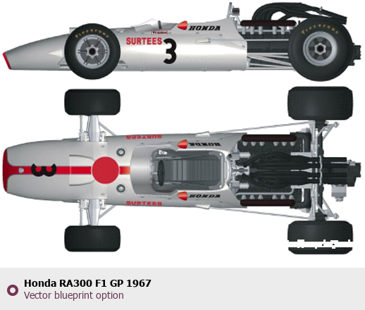 Raster blueprint of the 1967 Honda RA300 F1 GP Formula. This free downloadable image can be used for graphic projects, digital design, and 3D modeling. The file provides accurate exterior proportions of the vehicle. Model year: 1967. Body type: Formula.