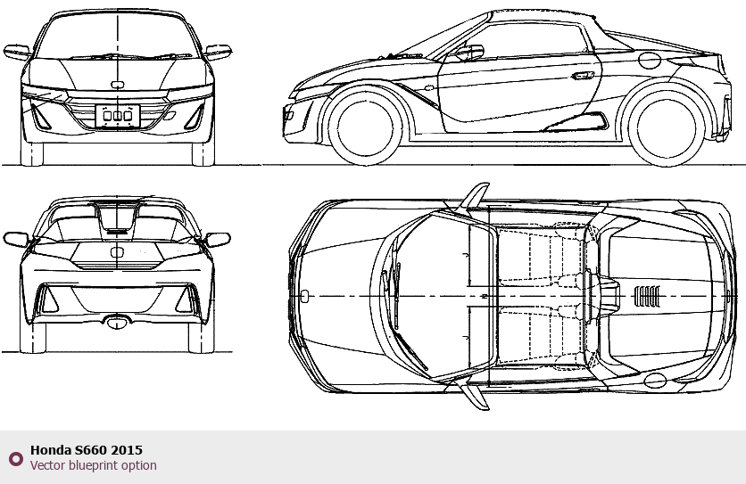 Raster blueprint of the 2015 Honda S660 Roadster. This free downloadable image can be used for graphic projects, digital design, and 3D modeling. The file provides accurate exterior proportions of the vehicle. Model year: 2015. Body type: Roadster.