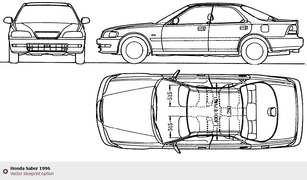 Raster blueprint of the 1996 Honda Saber Sedan. This free downloadable image can be used for graphic projects, digital design, and 3D modeling. The file provides accurate exterior proportions of the vehicle. Model year: 1996. Body type: Sedan.