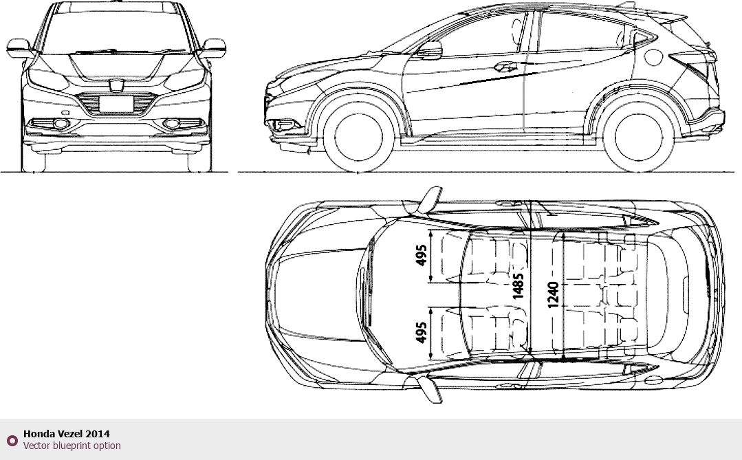 Raster blueprint of the 2014 Honda Vezel SUV. This free downloadable image can be used for graphic projects, digital design, and 3D modeling. The file provides accurate exterior proportions of the vehicle. Model year: 2014. Body type: SUV.