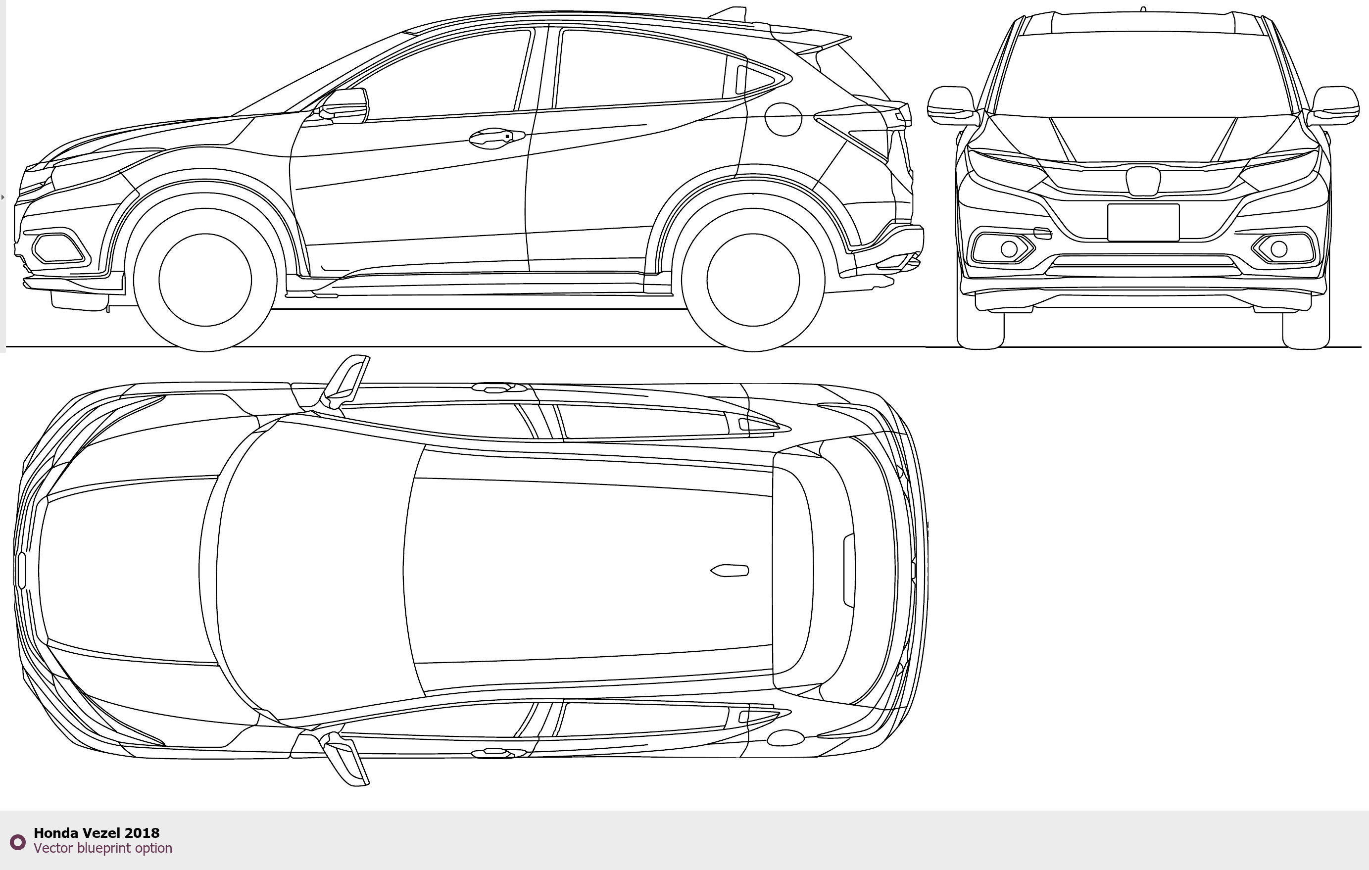 Raster blueprint of the 2018 Honda Vezel SUV. This free downloadable image can be used for graphic projects, digital design, and 3D modeling. The file provides accurate exterior proportions of the vehicle. Model year: 2018. Body type: SUV.