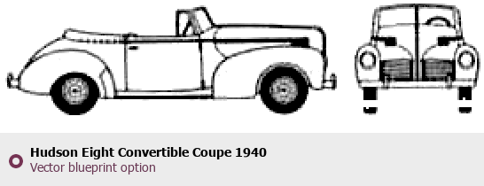 Raster blueprint of the 1940 Hudson Eight Convertible Coupe Coupe. This free downloadable image can be used for graphic projects, digital design, and 3D modeling. The file provides accurate exterior proportions of the vehicle. Model year: 1940. Body type: Coupe.