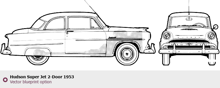 Raster blueprint of the 1953 Hudson Super Jet 2-Door Tag. This free downloadable image can be used for graphic projects, digital design, and 3D modeling. The file provides accurate exterior proportions of the vehicle. Model year: 1953. Body type: Tag.