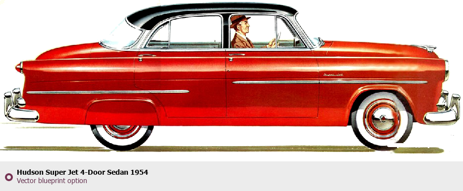 Raster blueprint of the 1954 Hudson Super Jet 4-Door Sedan Sedan. This free downloadable image can be used for graphic projects, digital design, and 3D modeling. The file provides accurate exterior proportions of the vehicle. Model year: 1954. Body type: Sedan.