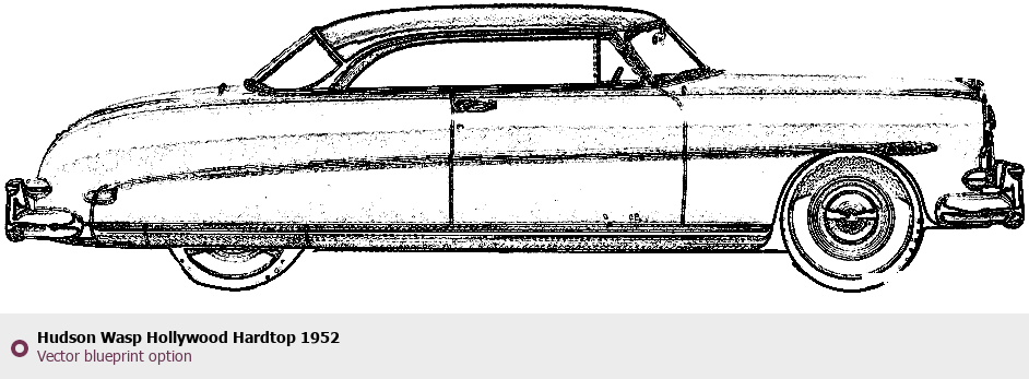 Raster blueprint of the 1952 Hudson Wasp Hollywood Hardtop Tag. This free downloadable image can be used for graphic projects, digital design, and 3D modeling. The file provides accurate exterior proportions of the vehicle. Model year: 1952. Body type: Tag.