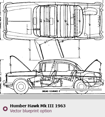Raster blueprint of the 1963 Humber Hawk Mk III Tag. This free downloadable image can be used for graphic projects, digital design, and 3D modeling. The file provides accurate exterior proportions of the vehicle. Model year: 1963. Body type: Tag.