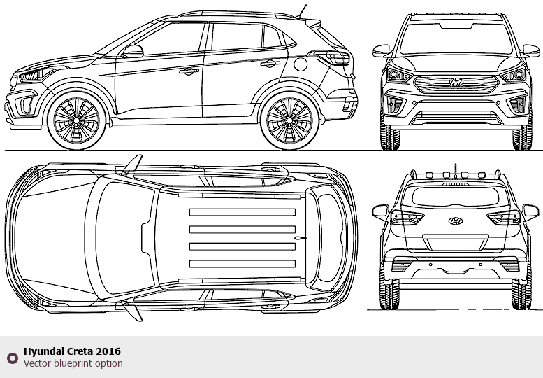 Raster blueprint of the 2016 Hyundai Creta SUV. This free downloadable image can be used for graphic projects, digital design, and 3D modeling. The file provides accurate exterior proportions of the vehicle. Model year: 2016. Body type: SUV.