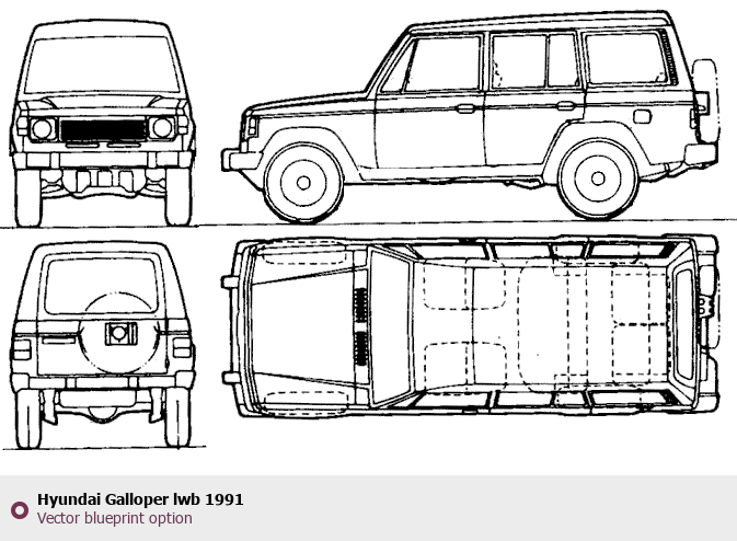 Raster blueprint of the 1991 Hyundai Galloper lwb SUV. This free downloadable image can be used for graphic projects, digital design, and 3D modeling. The file provides accurate exterior proportions of the vehicle. Model year: 1991. Body type: SUV.