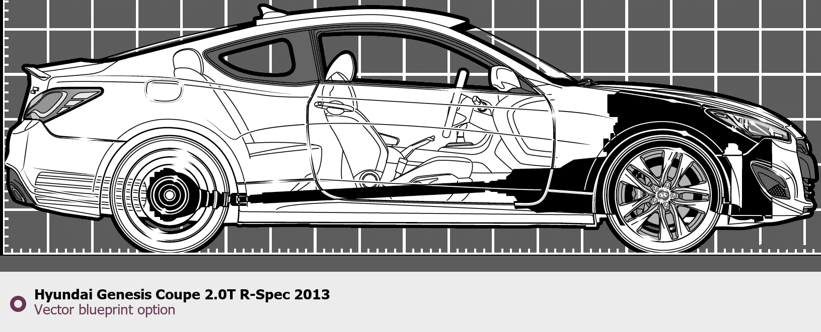 Raster blueprint of the 2013 Hyundai Genesis Coupe 2.0T R-Spec Sedan. This free downloadable image can be used for graphic projects, digital design, and 3D modeling. The file provides accurate exterior proportions of the vehicle. Model year: 2013. Body type: Sedan.