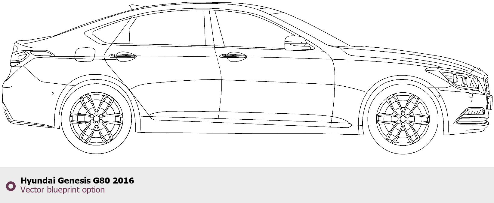 Raster blueprint of the 2016 Hyundai Genesis G80 Sedan. This free downloadable image can be used for graphic projects, digital design, and 3D modeling. The file provides accurate exterior proportions of the vehicle. Model year: 2016. Body type: Sedan.